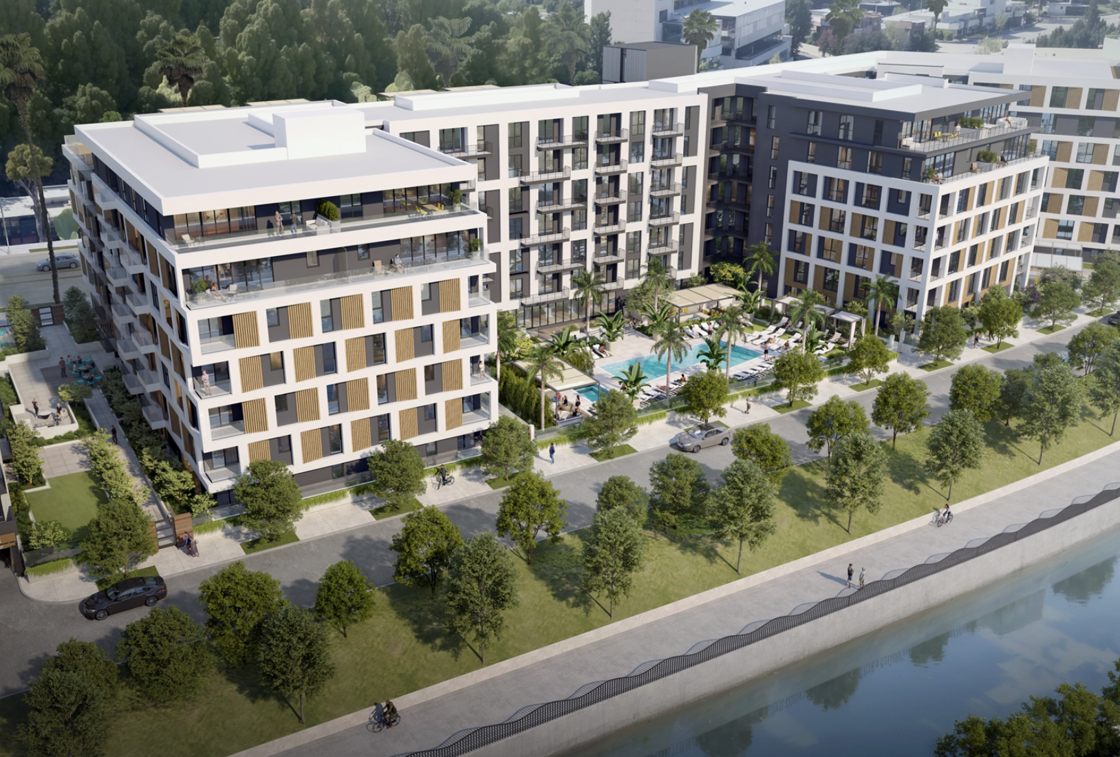 The architectural firm MVE + Partners is designing the complex. MVE + Partners has an established track record in Southern California, having designed major projects including the 21-story One Museum Square luxury apartment community in Los Angeles. According to the firm's project narrative, the site's sloping topography toward the adjacent river, as well as requirements to provide a mid-block crossing and step backs from the waterway, provided challenges to the design effort.
